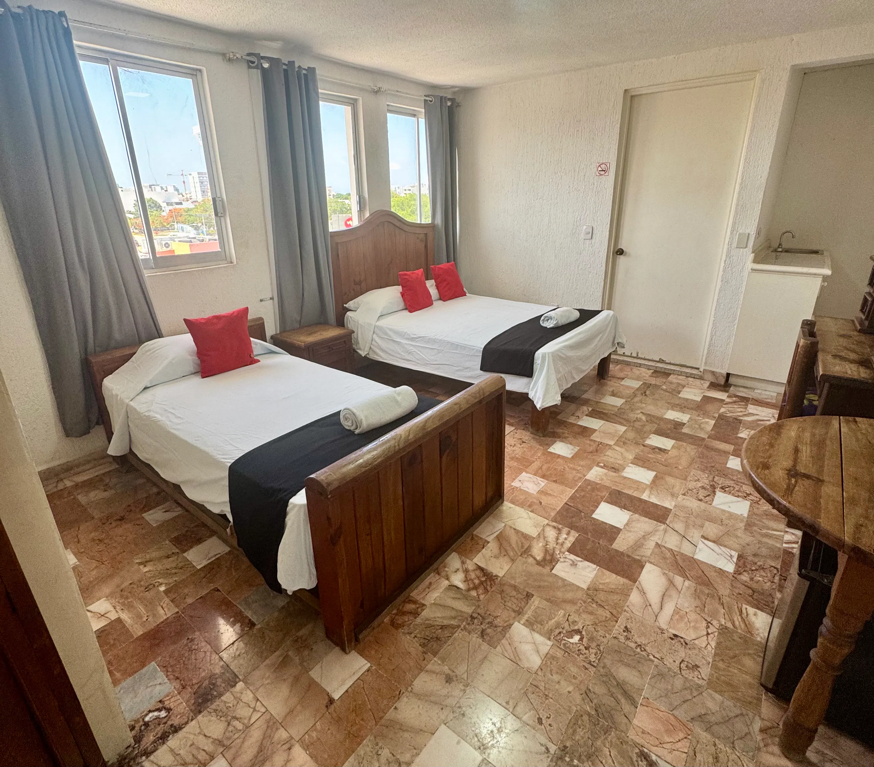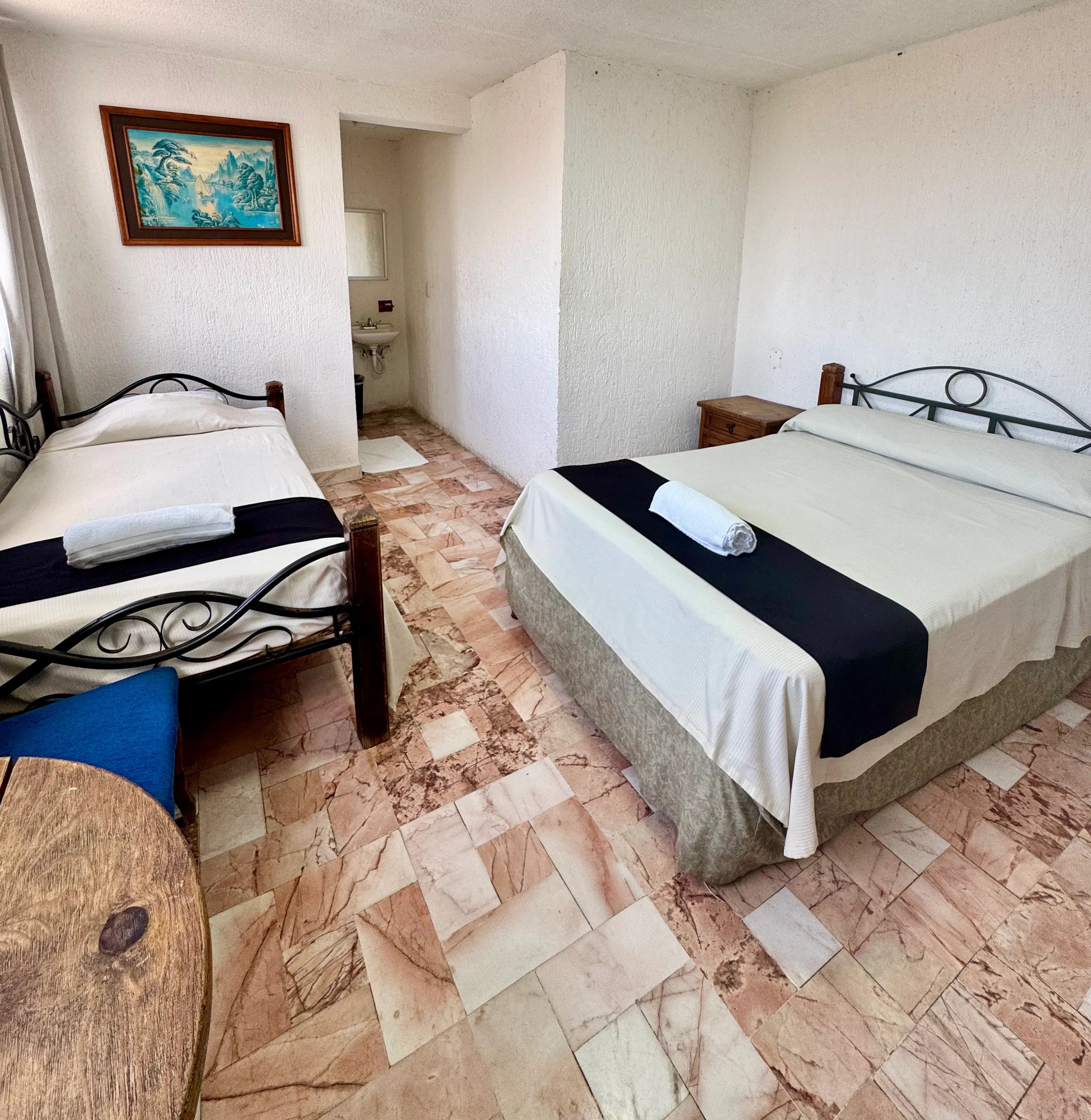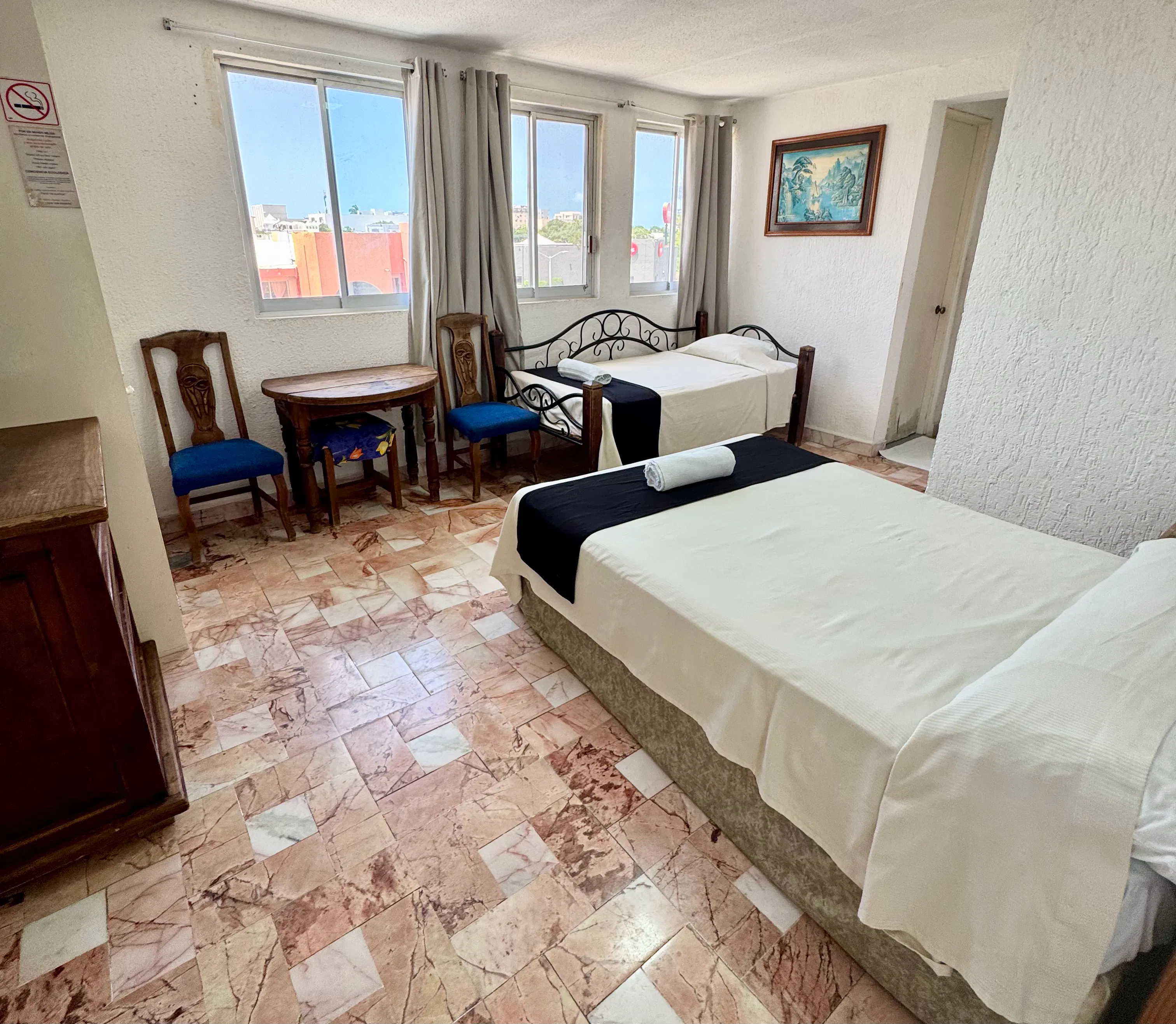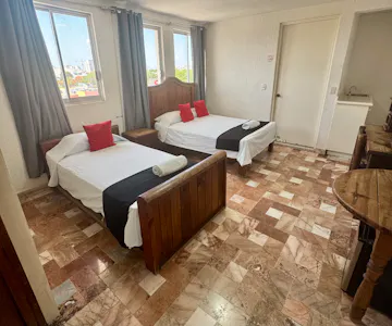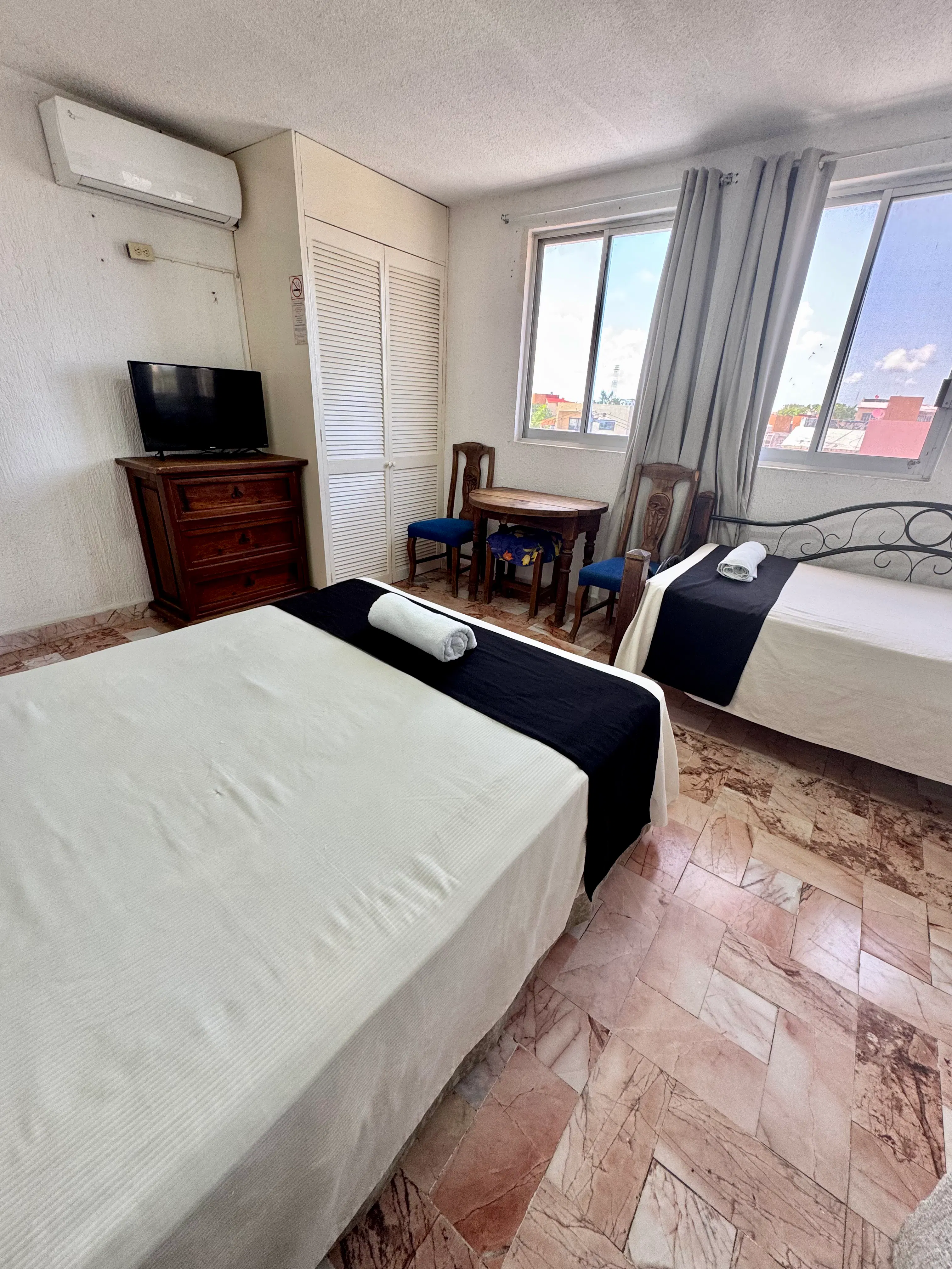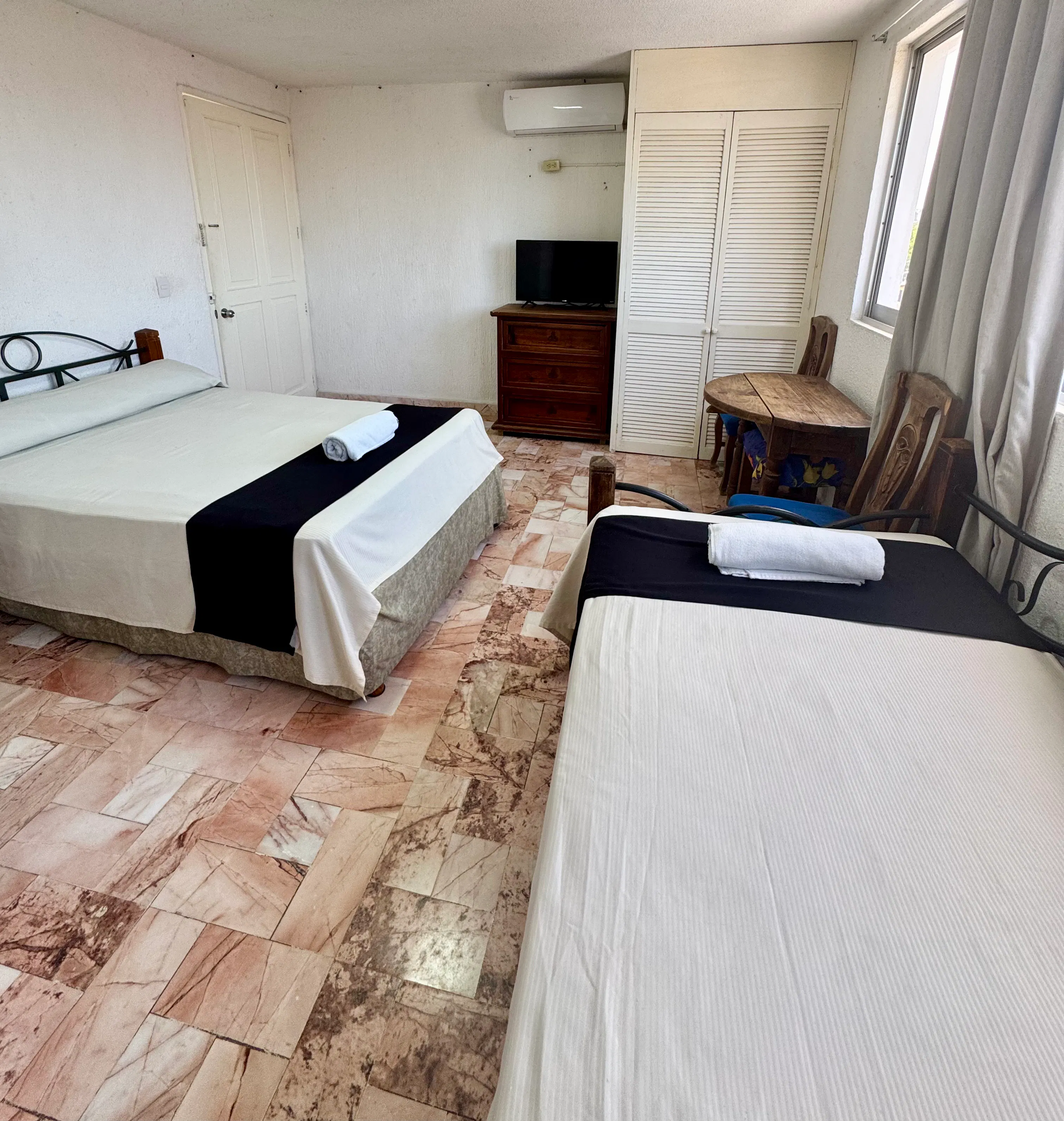 Esta habitación cuenta con una cama matrimonial y una cama individual, ideal para grupos pequeños o familias. Está equipada con aire acondicionado, smart TV y Wi-Fi gratuito, brindando comodidad y conveniencia durante tu estancia.